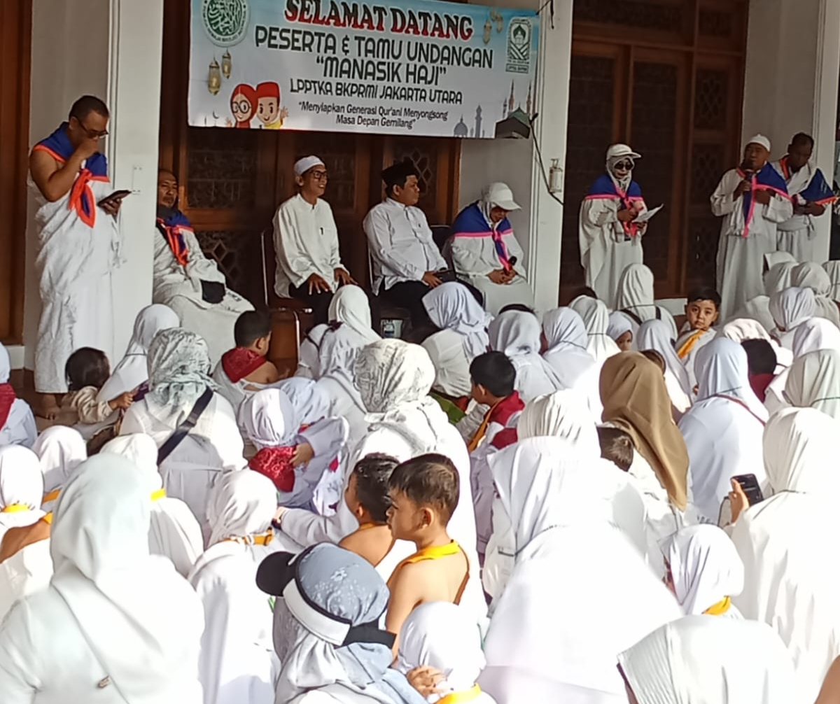 Jakarta (Pondok Gede) – Suasana haru dan khidmat menyelimuti halaman Asrama Haji Pondok Gede, saat ribuan santri TPQ dan TPA yang tergabung dalam Lembaga Pembinaan dan Pengembangan Taman Kanak-kanak Al-Qur’an (LPPTKA) BKPRMI Jakarta Utara mengikuti kegiatan Manasik Haji Santri, Ahad 19 Oktober 2025.